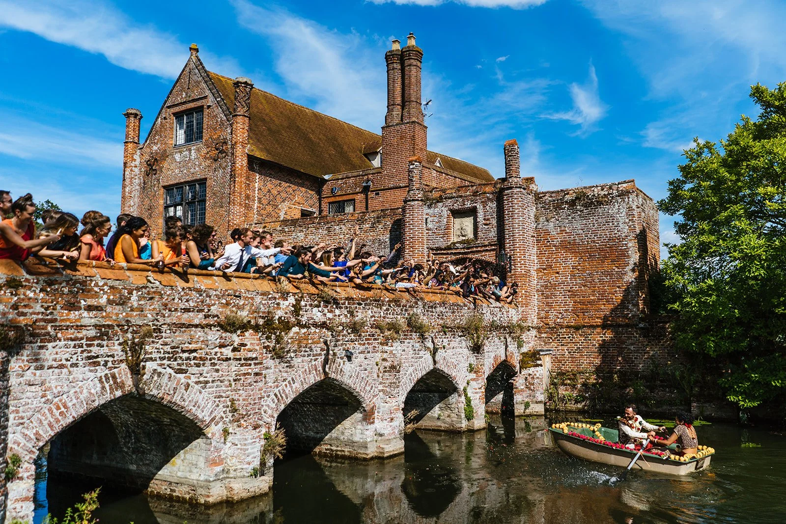 Guests watch the newly married couple rowing on the moat, with Crow’s Hall and its historic barn beyond – a setting shaped by careful restoration, renewal and the ongoing life of the estate.