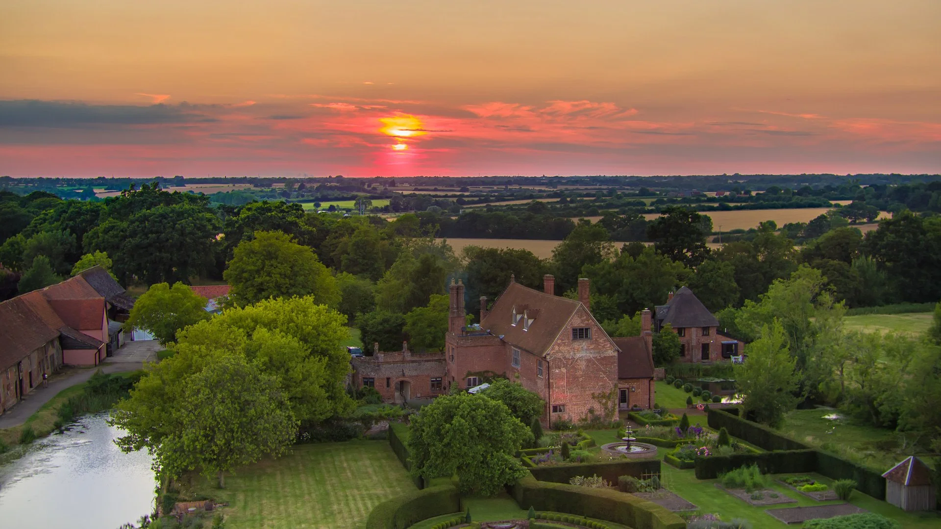 An aerial view of Crow’s Hall, with the Hall, gardens and surrounding moat revealing the beauty and structure of an estate carefully restored over recent years.
